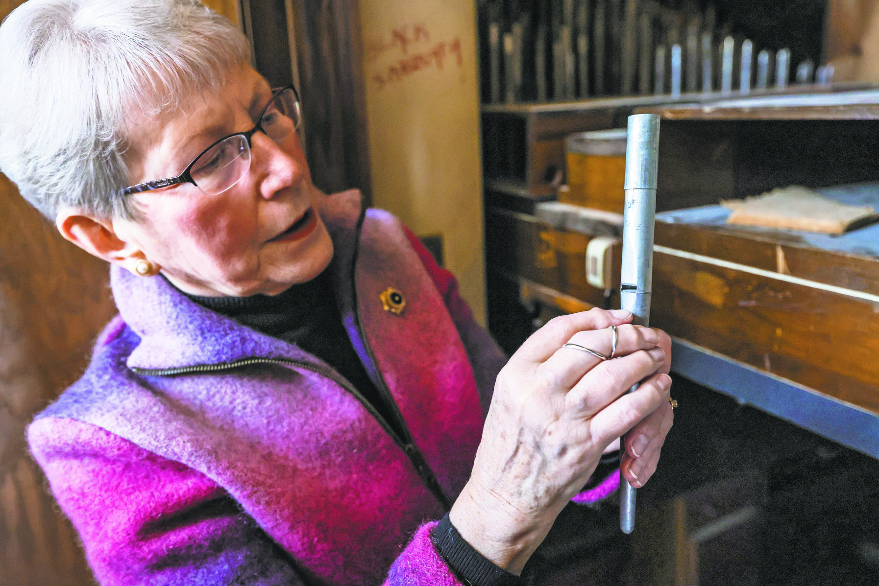 Carol Donahue of Duluth explains the parts of one of the hundreds of pipes that are a part of a George Kilgen & Son pipe organ at Denfeld High School on Thursday in Duluth.