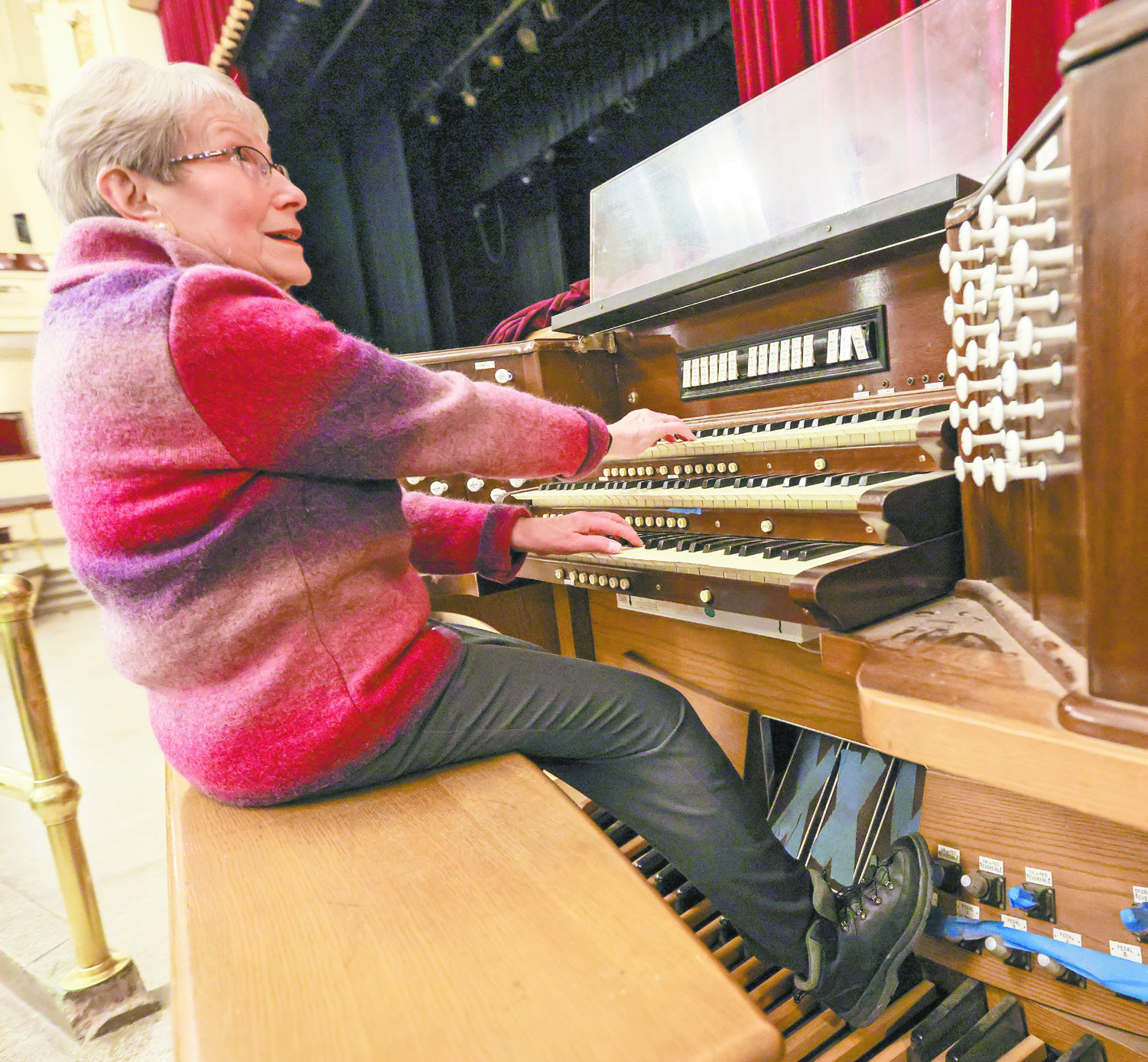 Carol Donahue demonstrates how to play a pipe organ on the current console installed at Denfeld High School. The console is not the original one that was installed with the organ.