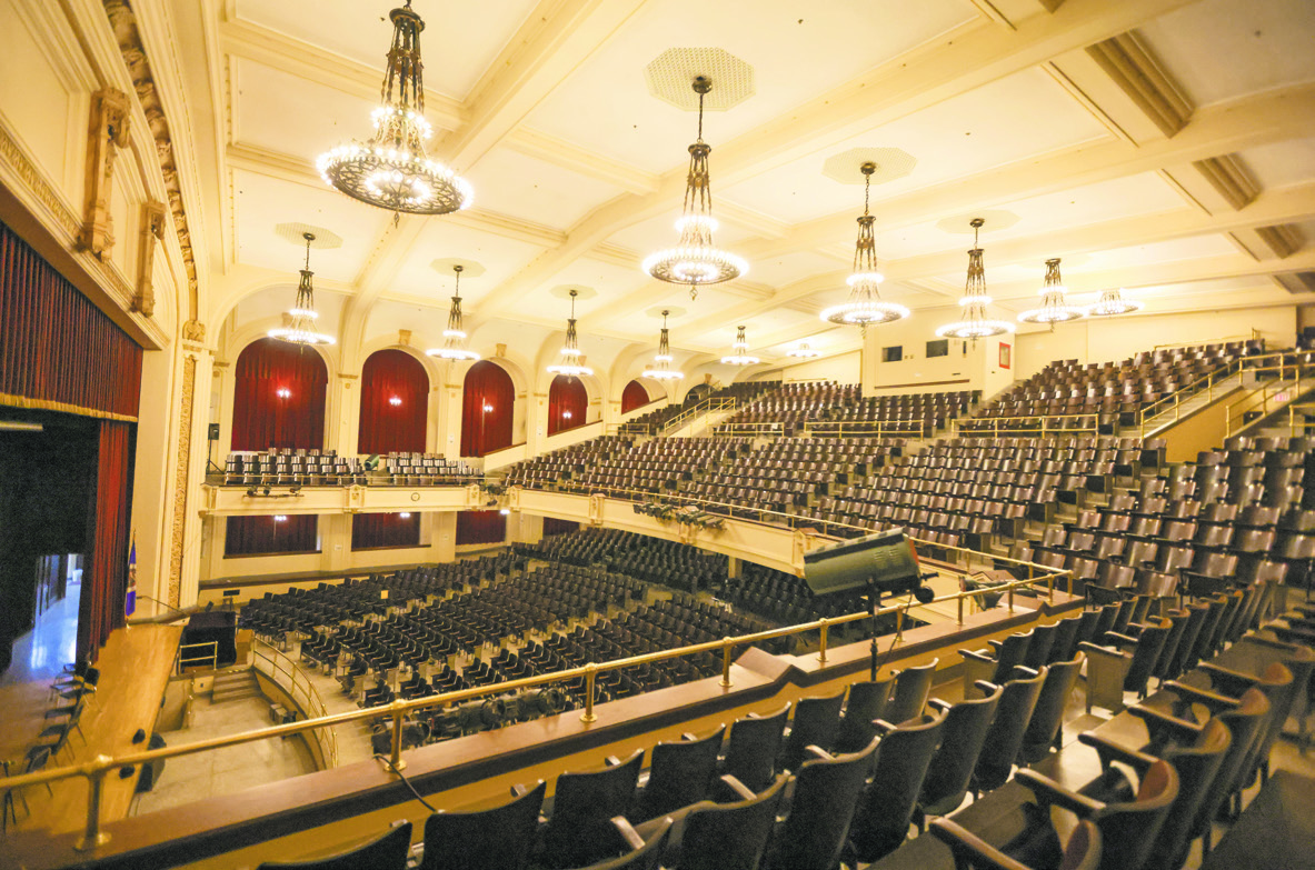 The only obvious sign the organ is there, though, is its “console,” a boxy device to the right of the auditorium stage that resembles an overgrown player piano. If the organ were operational, a performer could use the console’s three keyboards, 32 foot pedals, and row after row of knobs and buttons to produce thunderous symphonies.